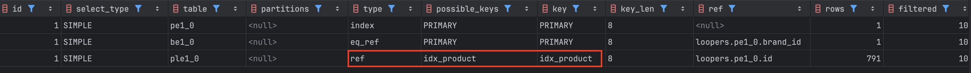 쿼리 실행 계획은 product_id를 기반으로 생성한 인덱스를 사용하여 조회 행수를 크게 줄인 것 또한 확인할 수 있다.
