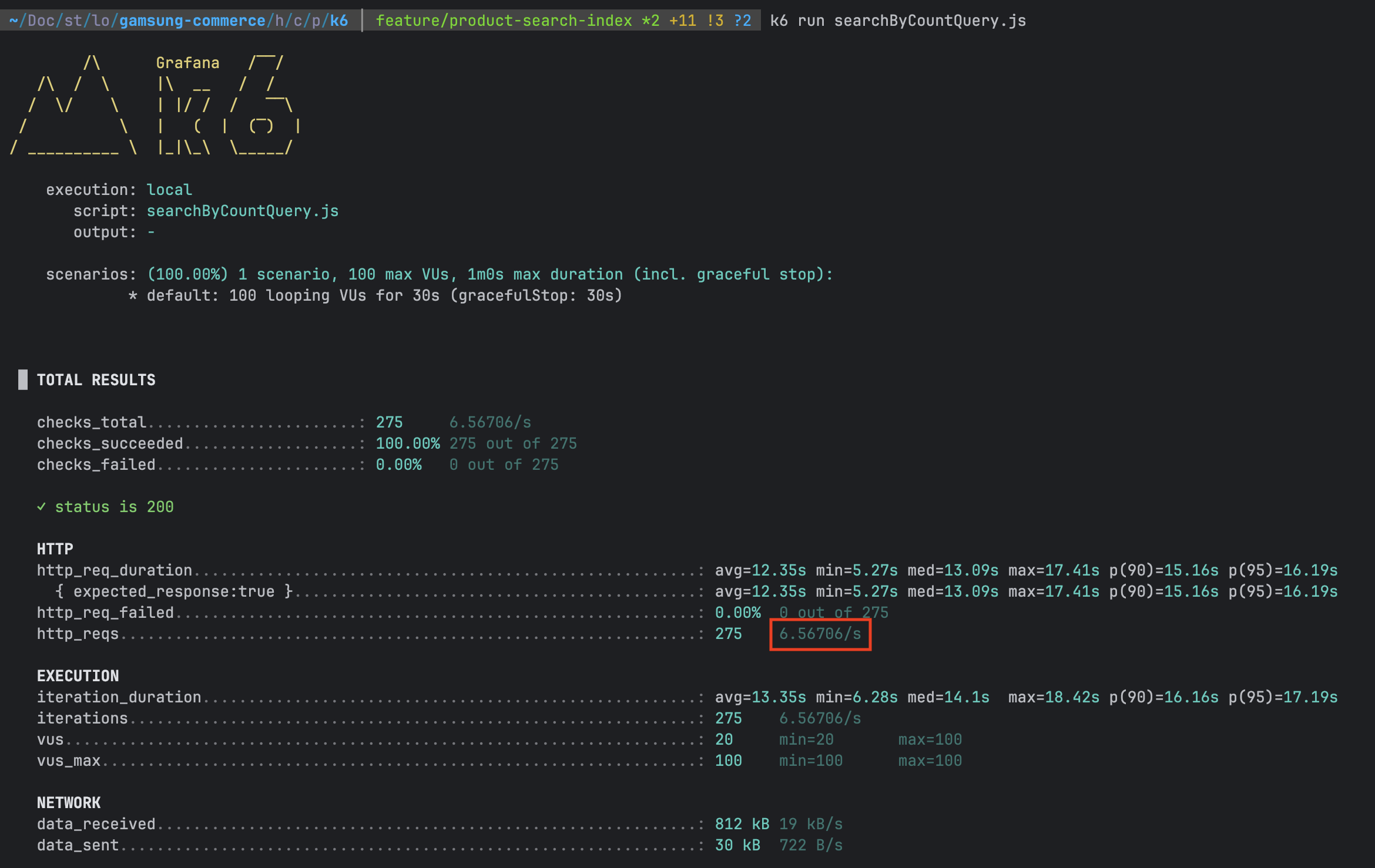 k6를 통한 부하 테스트 결과, 약 6.5 TPS로 인덱스 미적용 CONT 집계 쿼리에 비해 약 34배 성능이 개선된 것을